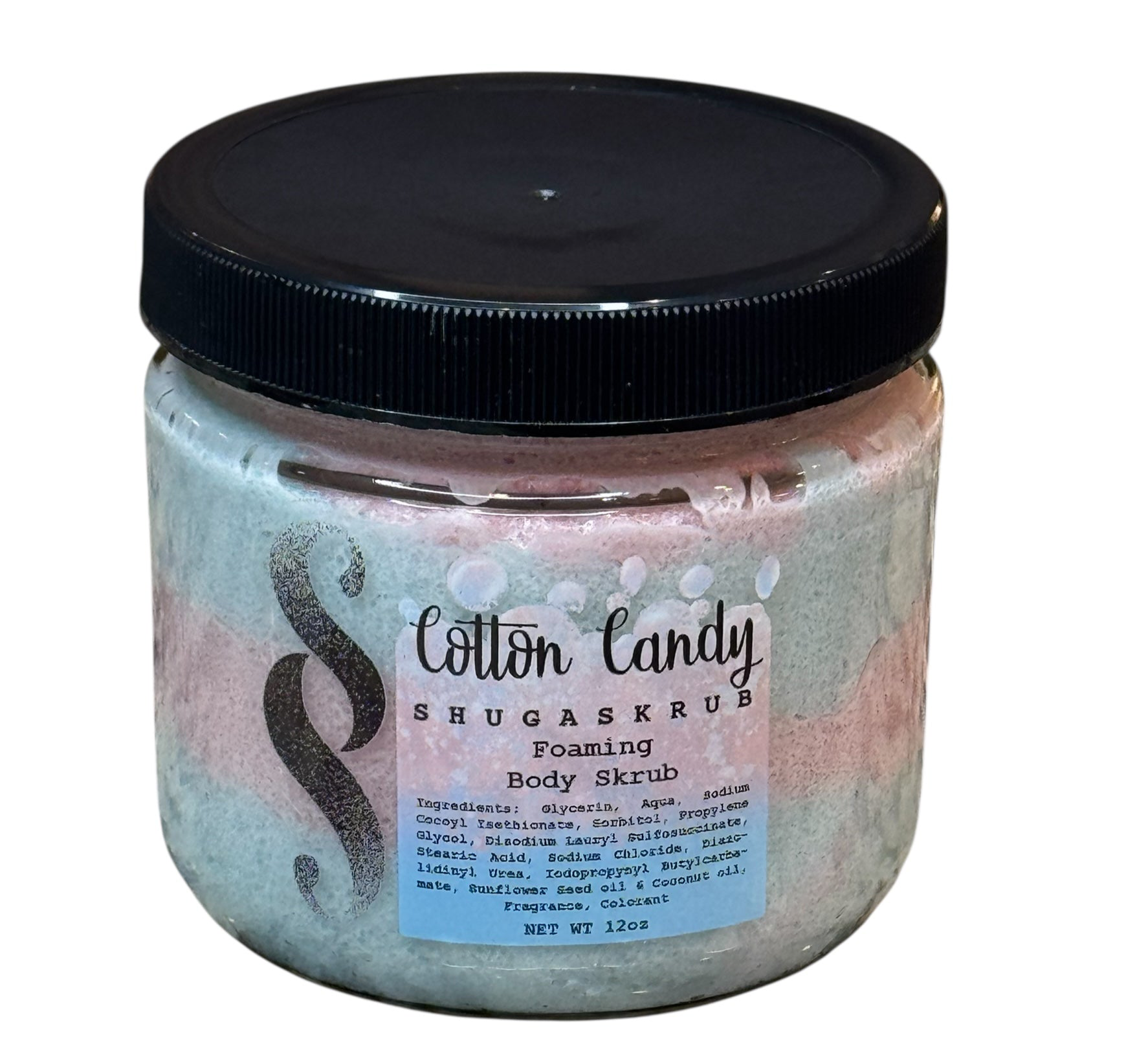 Gently exfoliate and pamper your skin with our foaming sugar scrub. Our foaming cotton candy scrub will leave your skin looking polished and feeling soft. Your mind will be relaxed from the sweet notes of candy.